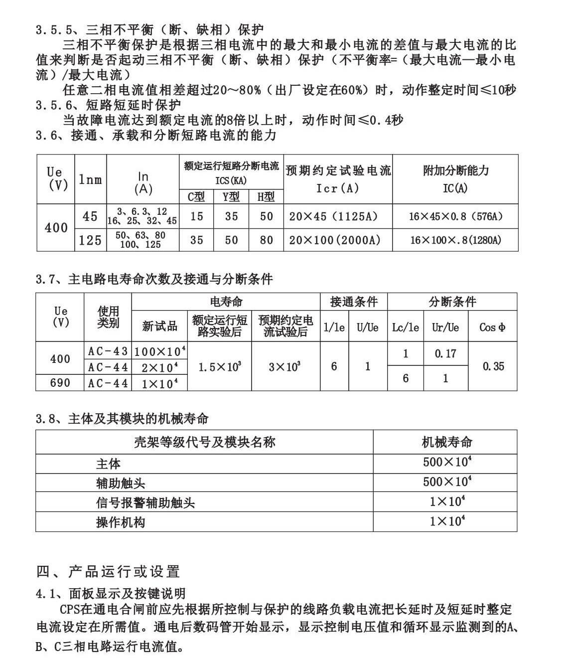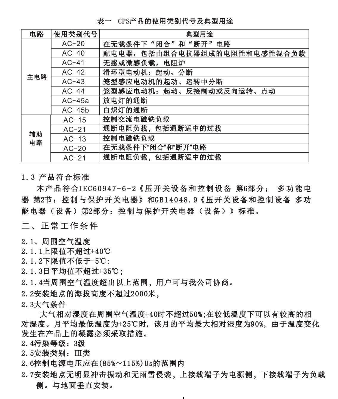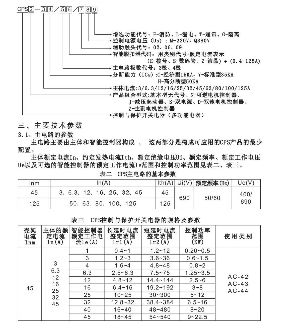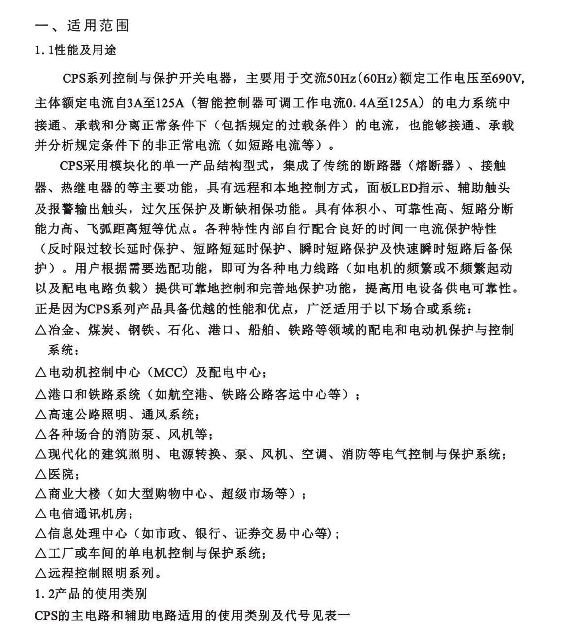 CPS系列控制与保护开关电器,主要用于交流50Hz(60Hz)额定工作电压至690V,主体额定电流自3A至125A(智能控制器可调工作电流0.4A至125A)的电力系统中接通、承载和分离正常条件下(包括规定的过载条件)的电流,也能够接通、承载并分析规定条件下的非正常电流(如短路电流等)