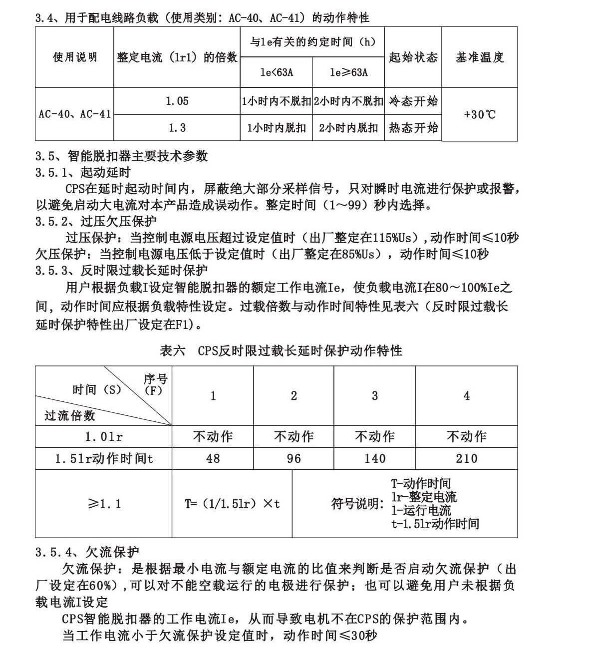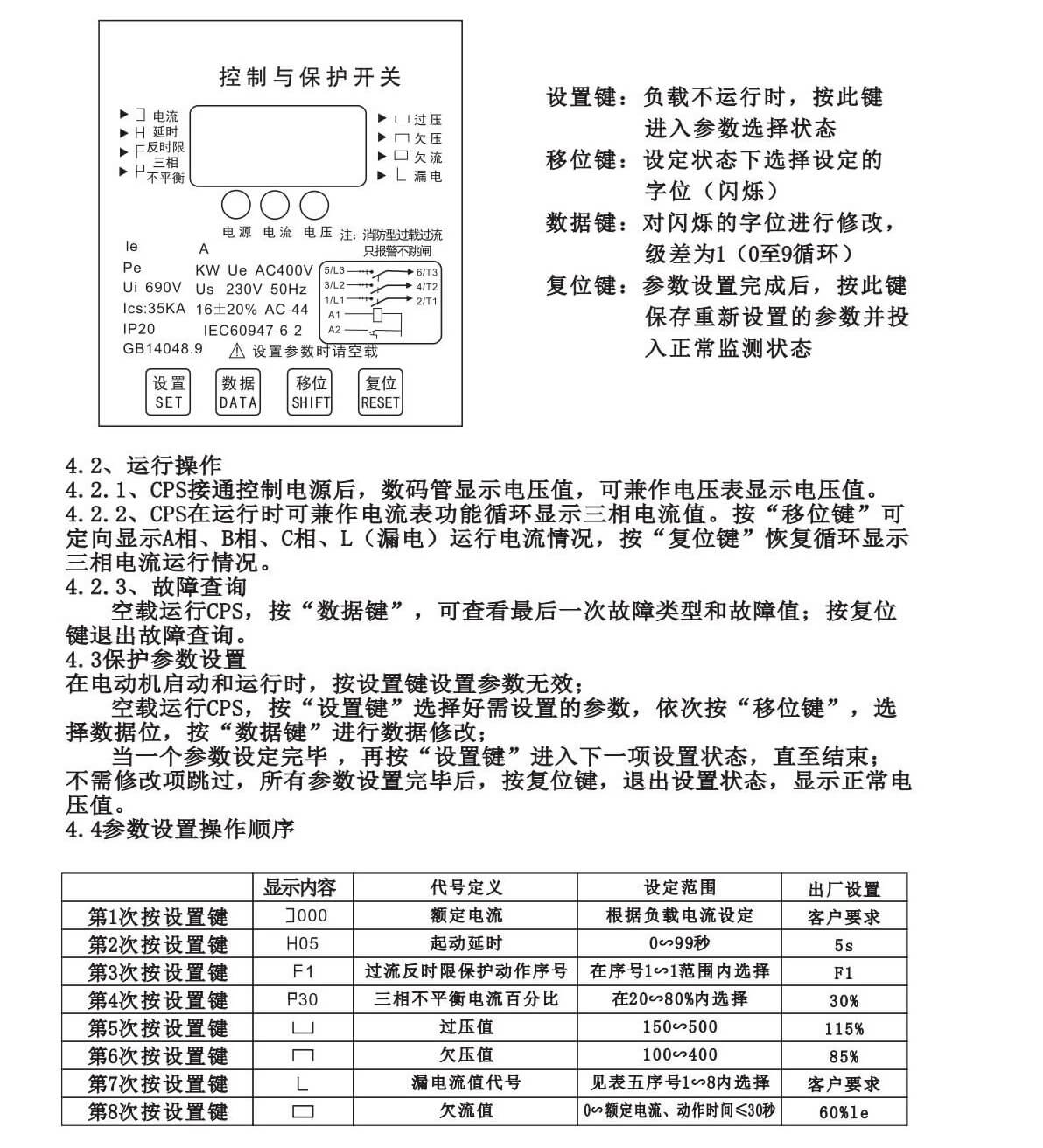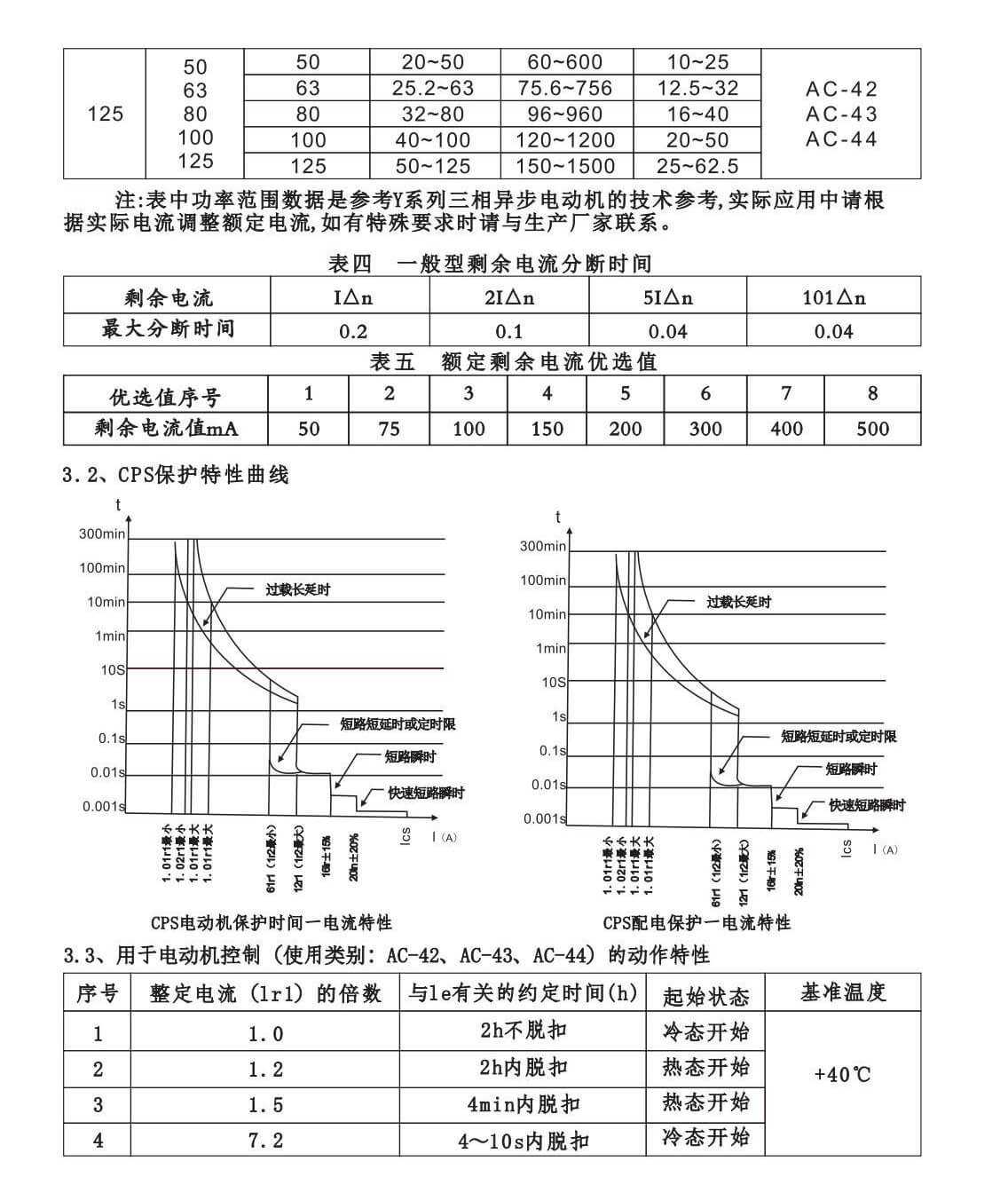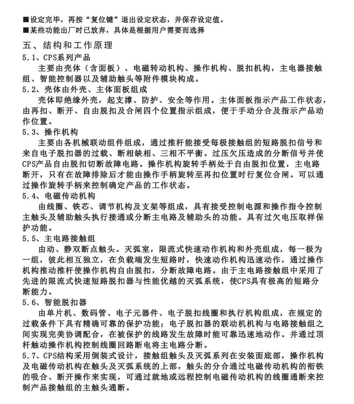 CPS系列控制与保护开关电器,主要用于交流50Hz(60Hz)额定工作电压至690V,主体额定电流自3A至125A(智能控制器可调工作电流0.4A至125A)的电力系统中接通、承载和分离正常条件下(包括规定的过载条件)的电流,也能够接通、承载并分析规定条件下的非正常电流(如短路电流等)